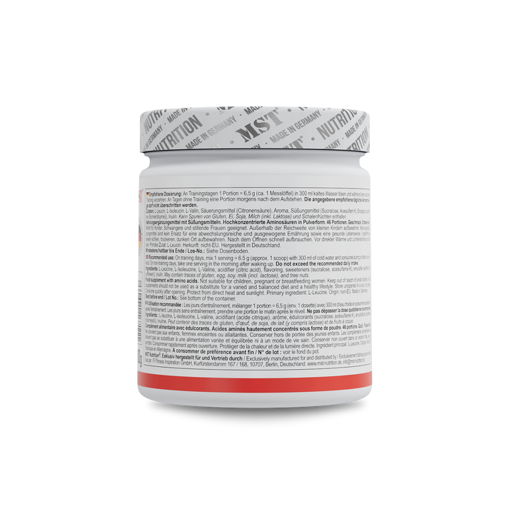 L-Leucin 38,5 %, L-Isoleucin 19,2 %, L-Valin 19,2 %, Säuerungsmittel (Zitronensäure), Inulin, Aroma, Süßungsmittel (Sucralose), Emulgator (Lecithine [Sonnenblume]).