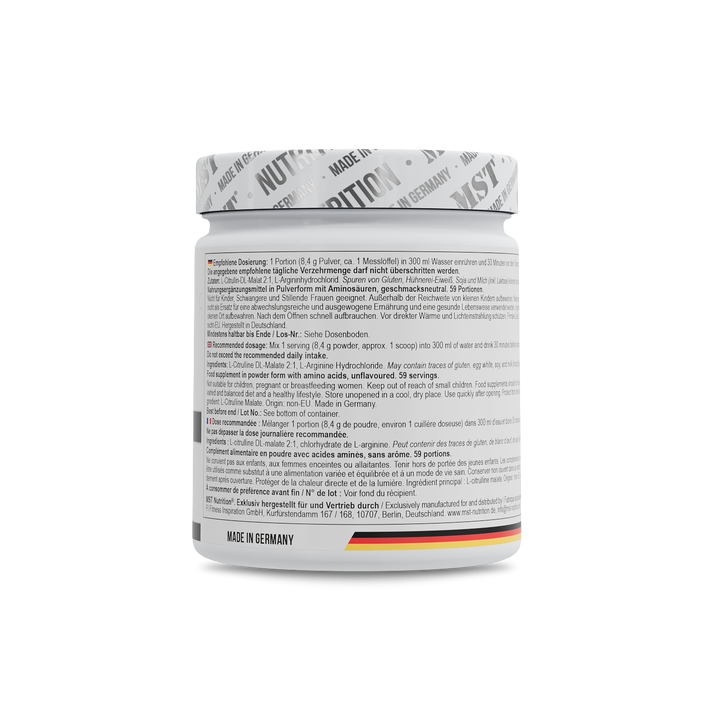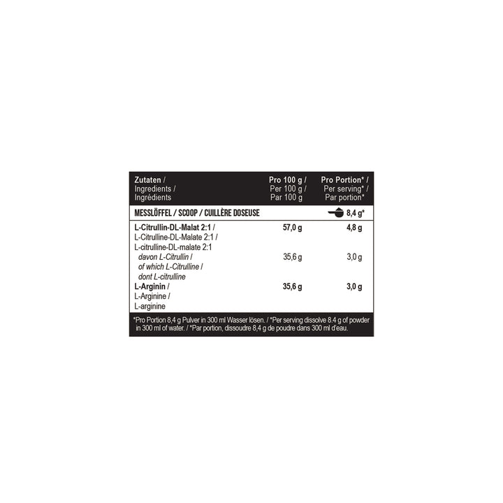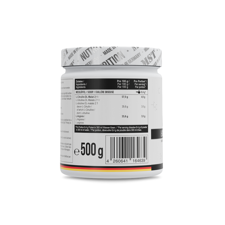 - Alta dosis de L-Arginina (3000 mg) y L-Citrulina (3000 mg)